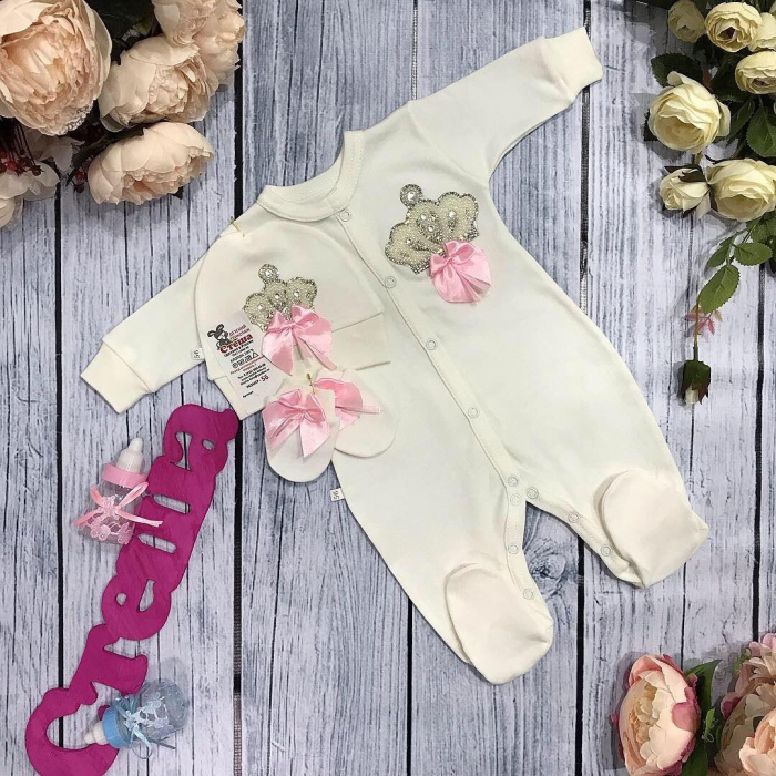 Комбинезон + шапка + царапки из интерлока-пенье. Украшен аппликацией из страз и бантами.