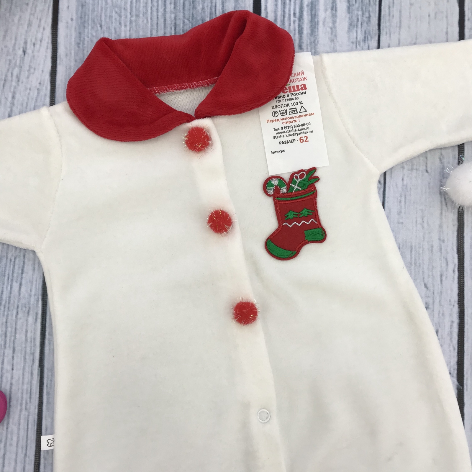 Теги: Купить оптом новогодний комбинезон от производителя. 244. Комбинезон Санта, хлопок 80% велюр 20% ПЭ, молочный 56,62,68 цена,отзывы официальный сайт "Стеша Серов"